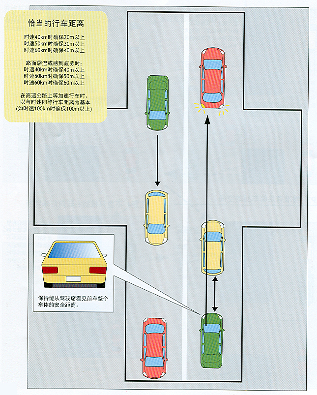 当察觉险情,可安全的紧急停车、不被追尾的距离为停止距离。下表中标明的是不同车速时的安全行车距离。如果行车距离低于这些数值,就容易发生追尾事故。实际上,在市区道路上行驶很难确保这样的行车距离。因此,平时应该多多注意基本行车距离,时时存有危机防范意识。新手上路或疲劳驾驶时更应该注意保持安全行车距离,以确保安全。