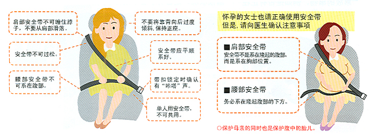 | 行驶时必须系好安全带。在发生撞车事故时助手席受到的伤害与驾驶席是相同的,所以不仅是驾驶者,在助手席的人也必须系好安全带。 | 安全带是最简单的,但又是能发挥最大效果的安全装备。气囊等安全装备也是使用安全带的大前提下设计出来的。发生事故时不使用安全带的驾驶者的死亡率是使用安全带的驾驶者的 20 倍。 |