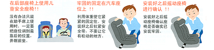 | 实际安装时,请参照车辆使用手册与儿童安全座椅安装说明。在这里我们介绍一些需要注意的地方。 | 对于身体太小,无法正确使用安全带的儿童,可以使用儿童安全座椅。和安全带的作用一样它可以固定儿童身体。在发生事故时,或是急刹车、急转弯时可以防止儿童从座位上摔落或在车内碰撞。 |