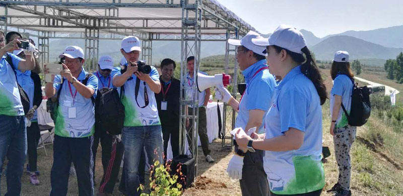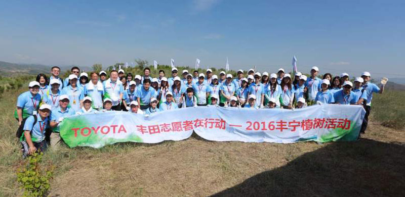 河北省丰宁县位于北京西北方约180 公里处,是沙漠化逼近北京的主要区域之一。自2001 年开始,丰田联手中国科学院中日科技与经济交流协会、河北省林业局/ 丰宁县林业局、日本NPO 地球绿化中心,共同开展“21世纪中国首都圈环境保护示范基地”项目。经过15年坚持不懈的植树造林活动,截至2014 年底,丰田中国在丰宁的植树造林项目已累计直接投入资金约3,750万元,植树约500 万棵,绿化总面积超过5 万亩以上,约等于4,200 个足球场,树木的成活率高达90% 以上。