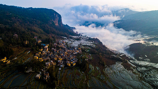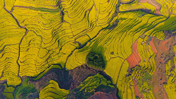 这就是云南,从高空俯瞰,山、河、湖、坝水乳交融,莹白、碧绿、湖蓝、绯红、明黄……如同打翻了的调色盘。