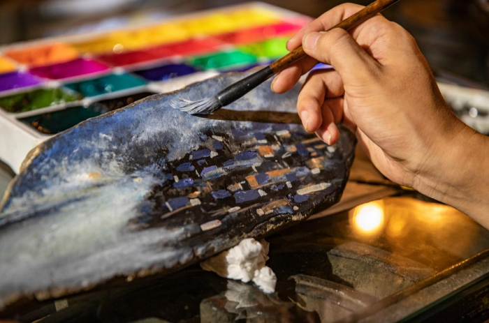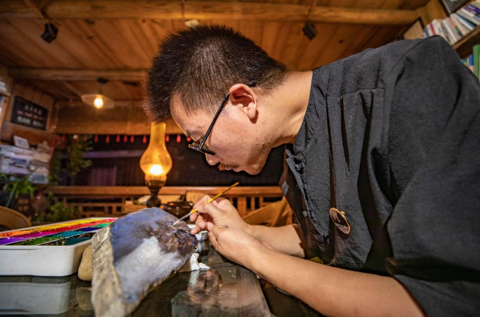 9月9日,在重庆酉阳龚滩古镇先生书屋,戚玉龙进行“龙画石”文创产品创作。新华社记者 黄伟 摄