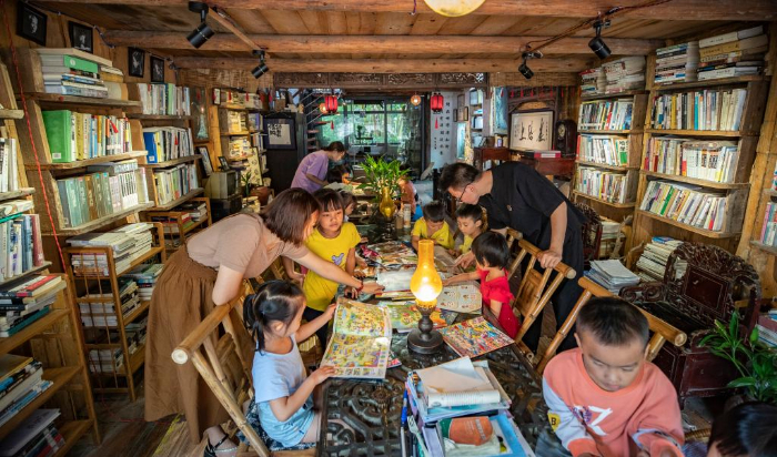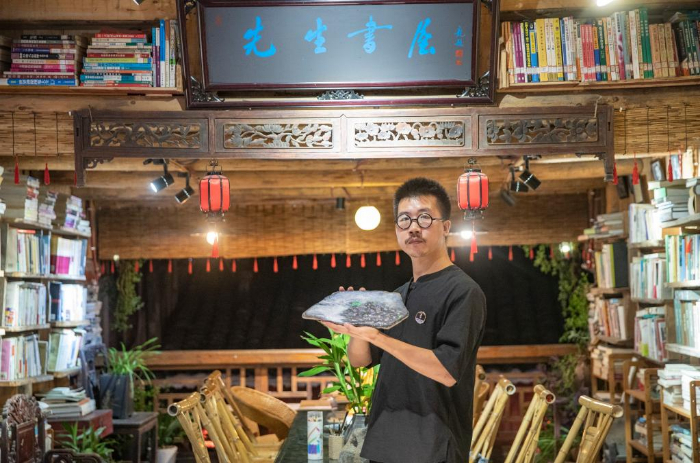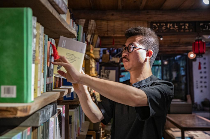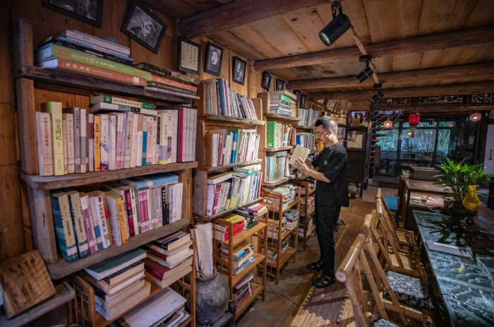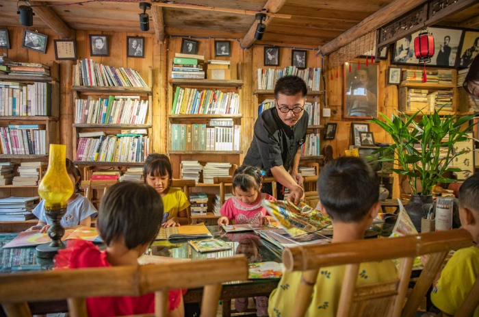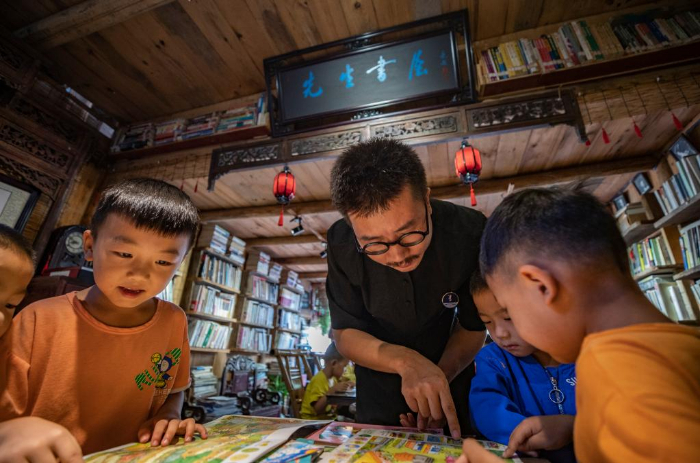 2013年,从四川美术学院油画专业毕业两年的戚玉龙,辞掉了大城市的工作,追寻偶像吴冠中的足迹来到重庆酉阳龚滩古镇,创办了先生书屋,以重庆图书馆捐赠的900册公益图书为基础,开始推广公益阅读。先生书屋不仅成为游客旅途中的书房,更是古镇居民身边的阅览室。 先生书屋的一楼是文创艺术品商店,店里摆放着戚玉龙的石头艺术作品;二楼是公益书屋,他把自己购买的书籍和游客、书商捐赠的书籍整整齐齐地摆放在书架上,精心装饰阅读空间;三楼则是他的住处。 近年来,在龚滩古镇景区管理部门的协助下,先生书屋成功举办“阅读一小时”“人在旅途”“诗歌沙龙”“跨年阅读夜”和幼儿“开蒙启智”等读书活动,在附近的幼儿园和村里开设了先生书屋的分馆,书籍则由先生书屋免费提供,不定期让分馆与书屋的藏书进行有序流动,使分馆周边的孩子和村民读到更多的新书、好书。 目前,先生书屋存书8000余册,每一本都是戚玉龙精心挑选的。他说自己“想做一个真正让读书人看得到书的平台”,尽可能影响更多的人自觉阅读。 新华社记者 黄伟 摄