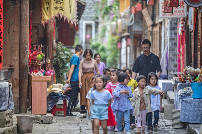 9月9日,在重庆酉阳龚滩古镇,戚玉龙领着龚滩古镇一所幼儿园的小朋友前往先生书屋。新华社记者 黄伟 摄