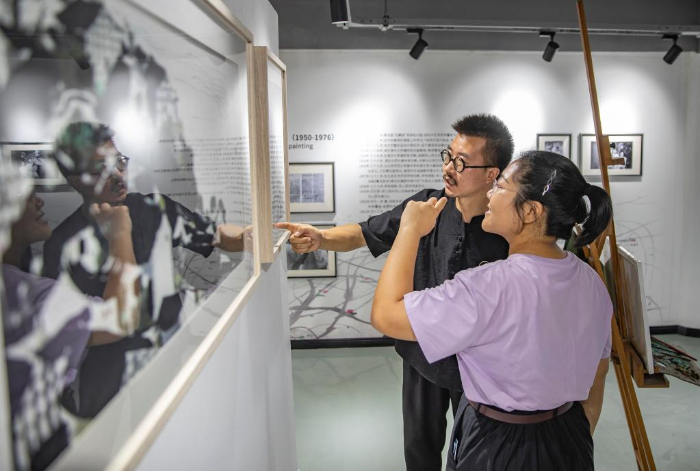 9月9日,在重庆酉阳龚滩古镇吴冠中纪念馆,被聘为纪念馆馆长的戚玉龙(后)为游客讲解吴冠中在龚滩的画作。新华社记者 黄伟 摄