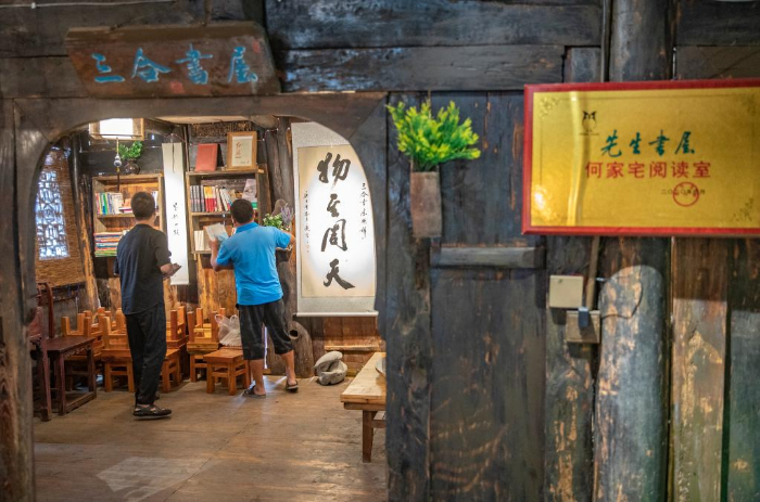 9月9日,在重庆酉阳龚滩古镇,戚玉龙在整理先生书屋内的书籍。新华社记者 黄伟 摄