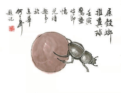 因为它力气大,那时我们就用硬纸片做成小车,有大拇指大小,并且还粘画上车厢、车把、车轱辘,把捉来的屎壳郎绑在车前,它就会拉着走,我们管这叫屎壳郎拉大车游戏。那时也有卖的,专为配合屎壳郎的微型玩具,花样很多,像轿车、篷车、大鞍车,也有做成鸡、鹅、虎豹等造型,罩在屎壳郎身上,当然都是小纸片做的,价格也十分便宜,就是哄小孩儿的。小贩吆喝时,把屎壳郎说成骡子:“好肥的骡子,好热的车呀!”我就买过屎壳郎车玩儿。后来,我捉到屎壳郎后,找个火柴盒扣到它身上,它就顶着火柴盒到处跑,我和弟弟妹妺们在院里空地上,看着它不辨方向地乱跑,高兴地手舞足蹈,在缺少儿童玩具的时代,这些昆虫给我们带来多大欢乐啊!