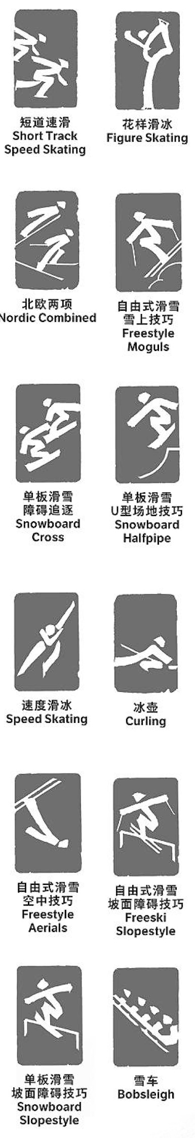 2022年北京冬奥会项目图标设计沿袭了2008年北京夏奥会项目图标的设计理念,充分利用了汉字中的篆刻、金文、剪纸等元素。在双奥“篆书之美”与“汉印”风格的图标中,汉字大放异彩,成功将其独特架构及哲学思想与人类对竞技体育的阐释在外形呈现、诗意联想、精神内涵三个维度达到完美融合。
