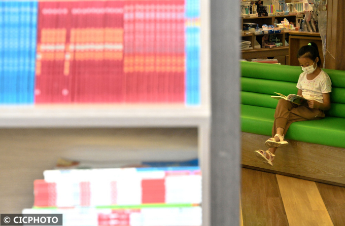 ↑2022年8月30日,河北省邯郸市,一名小朋友在书城里阅读图书。CICPHOTO/郝群英 摄