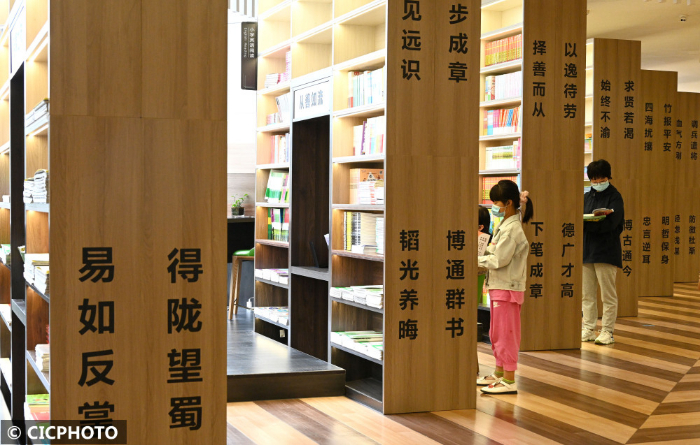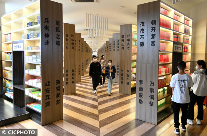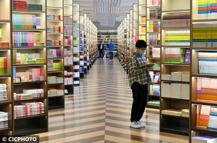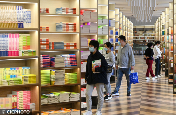 ↑2022年8月30日,河北省邯郸市,学生在书城里选购图书。CICPHOTO/郝群英 摄