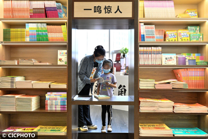 ↑2022年8月30日,河北省邯郸市,一名家长陪孩子在书城里选购图书。CICPHOTO/郝群英 摄