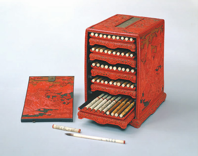 文房四宝与读书人的关系十分密切。展厅里陈列的宫中文房用具非常精美,引得观众驻足细赏。一件饰有云山水岸图案的红漆笔匣,里面装着50支毛笔,每支笔材质、装饰、笔头造型各不相同,笔管上分别题有乾隆在不同时期所撰咏花诗。