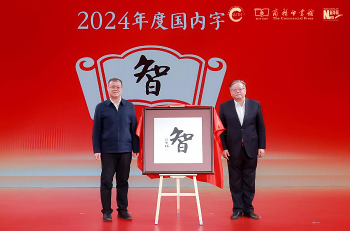 新华网党委常委、总编辑车玉明(左),商务印书馆党委书记、执行董事顾青(右)揭晓年度国内字“智”。新华网 发