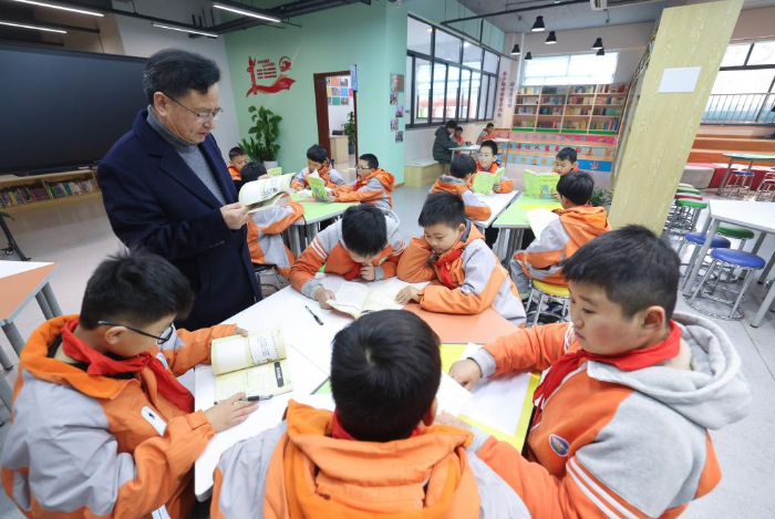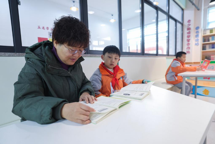 12月18日,在嘉兴市南湖区余新镇中心小学图书馆的“老少阅读攀登合作社图书漂流站”,退休教师陶坤华与孩子们一起阅读。新华社记者 徐昱 摄