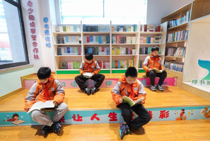 12月18日,学生们在嘉兴市南湖区余新镇中心小学图书馆的“老少阅读攀登合作社图书漂流站”读书。新华社记者 徐昱 摄