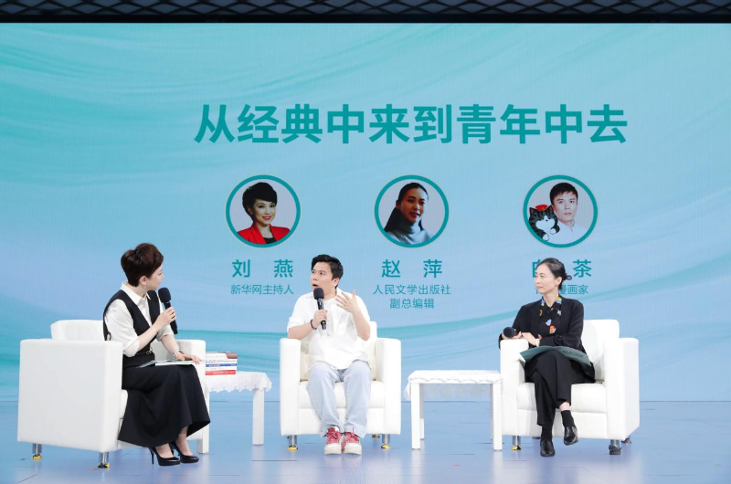 人民文学出版社副总编辑赵萍和青年漫画家白茶围绕“从经典中来到青年中去”主题进行对话,推荐阅读《就喜欢你看不惯我又干不掉我的样子》系列漫画。白茶向读者们分享了超人气IP“吾皇猫”和“巴扎黑”的创作历程。他希望把自己心里对于爱、成长、陪伴的真实感受带到大家面前,感动大家,治愈大家。赵萍指出,一个出版社如果没有面向未来、面向青年的一些作品,是没有长久生命力的。白茶的作品就是我们这个时代的编辑发掘的一部精品。经典不只属于过去,当下我们也在创造经典。