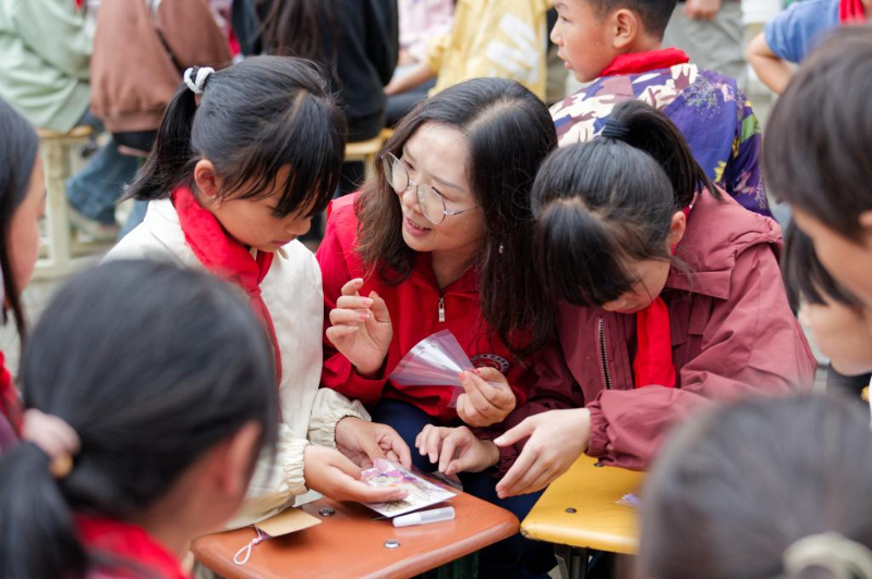 5月28日,在昭通市大关县翠华镇庆云小学,大关县图书馆馆长、“背篼图书馆”志愿服务队队长周荣燕(中)向学生讲解书签的制作方法。