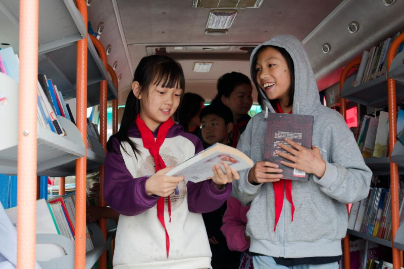 5月28日,昭通市大关县翠华镇庆云小学的学生们在“流动图书车”内挑选感兴趣的书籍。