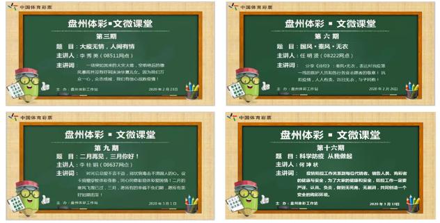 “盘州体彩工作站利用微信平台开设的‘盘州体彩•文微课堂’,用手机就能学,很方便。”“遵义是红色革命圣地,遵义体彩中心的‘红色讲堂’也格外有意义,让我印象深刻。”