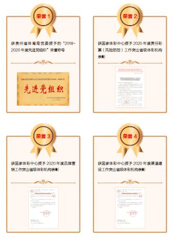 2020年,贵州体彩中心获得国家体彩中心2020年度责任彩票(风险防控)工作突出省级体彩机构表彰、2020 年度渠道建设工作突出省级体彩机构表彰和2020年度品牌营销工作突出省级体彩机构表彰。