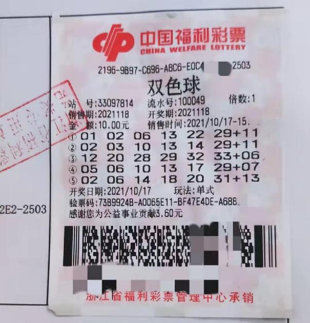 据周先生介绍,1月3日,是双色球2021001期开奖。为了迎接新一年的喜庆氛围,当日下午他花费10元机选了5注号码,第5注是“02、06、14、18、20、31+13”。当晚公布的开奖号码为“02、03、13、18、20、31+11”,没想到就这样击中了4个红球,中了10元。他开心地说:“我觉得第5注号码和我很有缘,每期都是重新机选4注,第5注一直保留守号。没想到守了10个月,就中大奖了。”!