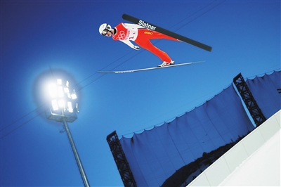 浙江选手甄炜杰在北京冬奥会跳台滑雪比赛中。本报记者 鹿麟摄