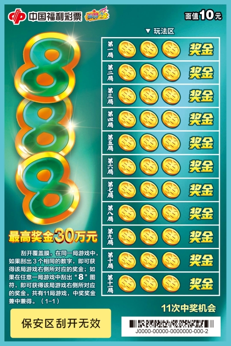 福彩刮刮乐“888”游戏,单张面值10元,最高奖金30万元,奖级10级,奖金返还率为65%。