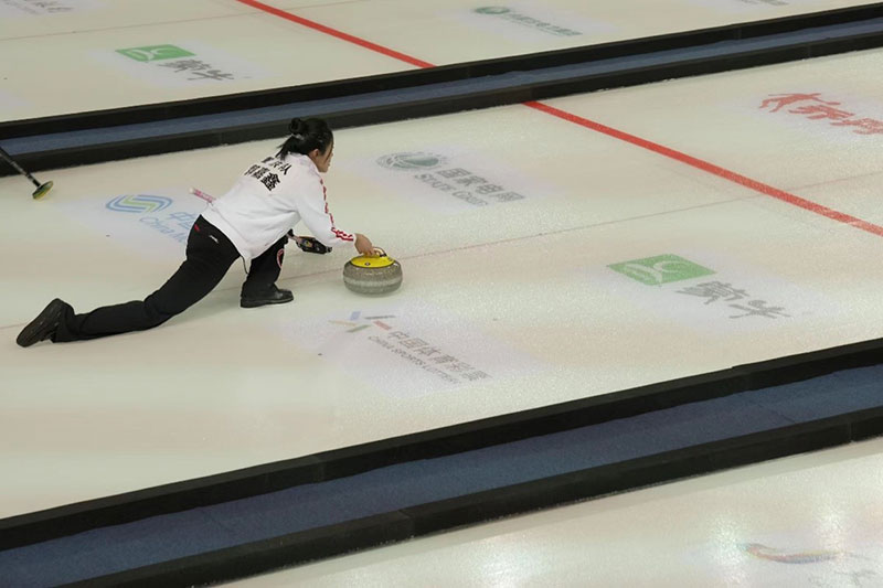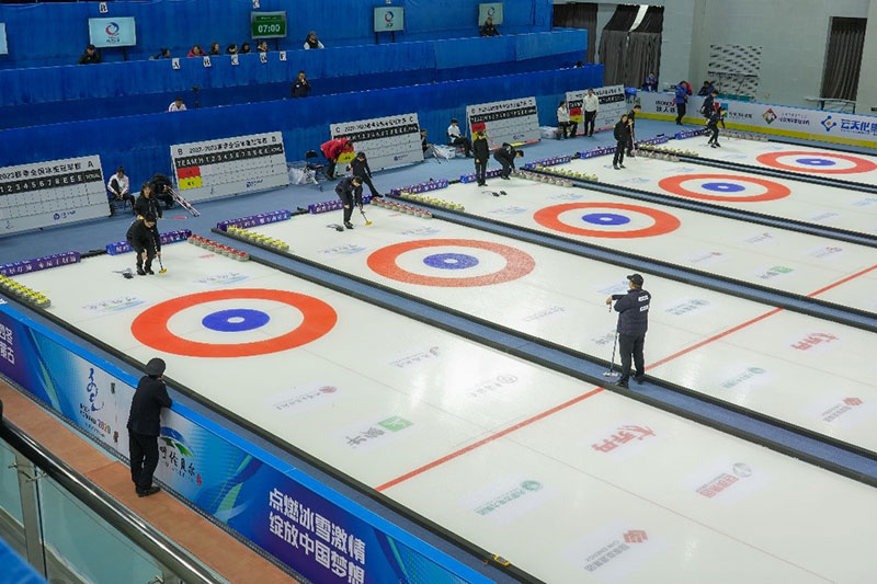 (4月23日下午,呼伦贝尔冰上运动中心正在进行“十四冬”冰壶项目的测试赛)