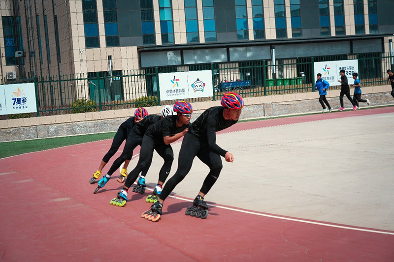 (兴安盟体育中学的学生们在场地进行轮滑和体能的训练)