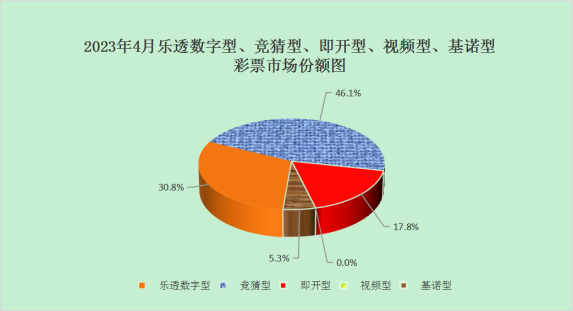 4月份,乐透数字型彩票销售154.94亿元,同比增加22.29亿元,增长16.8%;竞猜型彩票销售232.11亿元,同比增加125.45亿元,增长117.6%;即开型彩票销售89.36亿元,同比增加40.81亿元,增长84.1%;基诺型彩票销售26.85亿元,同比增加3.98亿元,增长17.4%。4月份,乐透数字型、竞猜型、即开型、基诺型彩票销售量分别占彩票销售总量的30.8%、46.1%、17.8%、5.3%。视频型彩票销售0.0022亿元,同比增加0.0021亿元。