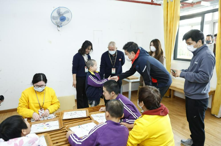 随后,大家来到康复训练室,与正在做认知训练的孩子们进行了简单交谈。训练室的墙壁上装有发声或发光装置,当不同位置的声音或灯光出现时,孩子们寻找位置并按下按钮,以此训练认知能力和反应能力。