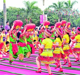 广西南宁市武鸣区“广西三月三”文化旅游节上的千人竹竿舞表演。尹宗浩摄