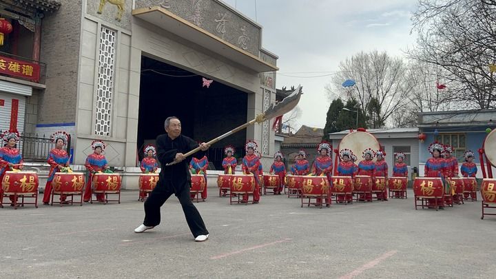 一位老人向游客展示杨家将武术。