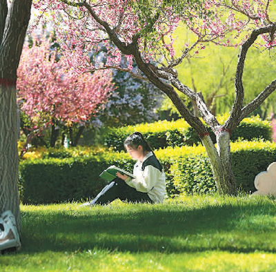 4月23日,一名大学生在甘肃河西学院校园内看书。陈 礼摄(新华社发)全民阅读氛围浓