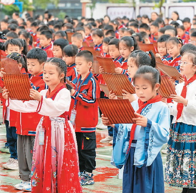 4月23日,广西壮族自治区梧州市红岭小学的学生在老师指导下,朗诵国学经典。何华文摄(人民图片)