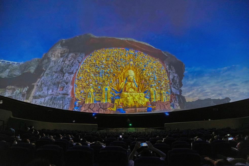 2022年7月首映的球幕电影,是活化利用大足石刻的另一个尝试。“除了多角度、全景式的体验,影片还让一些隐藏在深山中游客难以见到的石窟造像、一些被岁月侵蚀的石刻艺术,在影像中活了起来。”大足石刻研究院院长蒋思维说,电影中的绝大部分素材都源于大足石刻文物数字化复原成果。