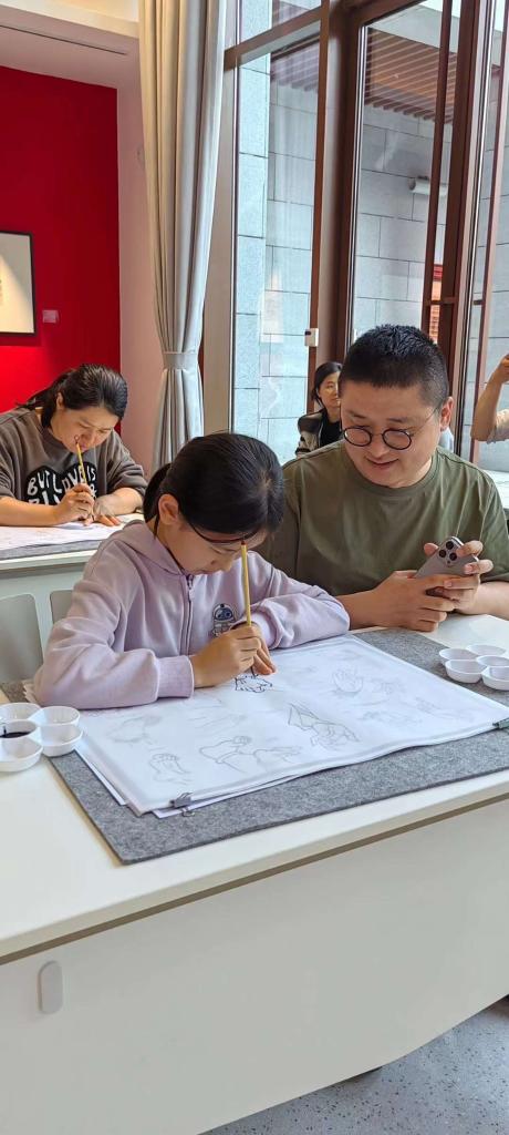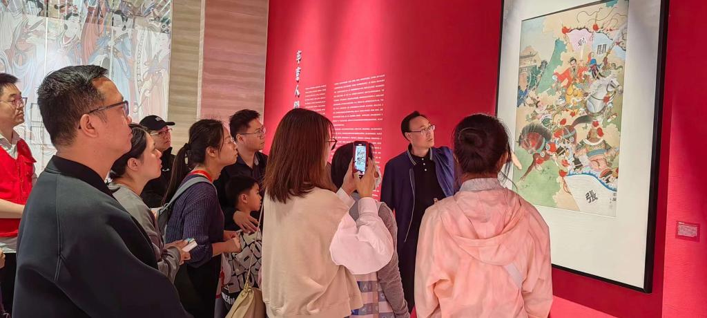 其中的“任率英工笔重彩连环画回顾展”展现了我国著名的工笔重彩人物画家和连环画家任率英的多部经典之作,包括《白蛇传》《桃花扇》《岳云》《将相和》《苏武》等作品的上百幅原画还原件。5月1日下午,不少观众还拿起毛笔,参加了展览配套的工笔画线描体验活动。