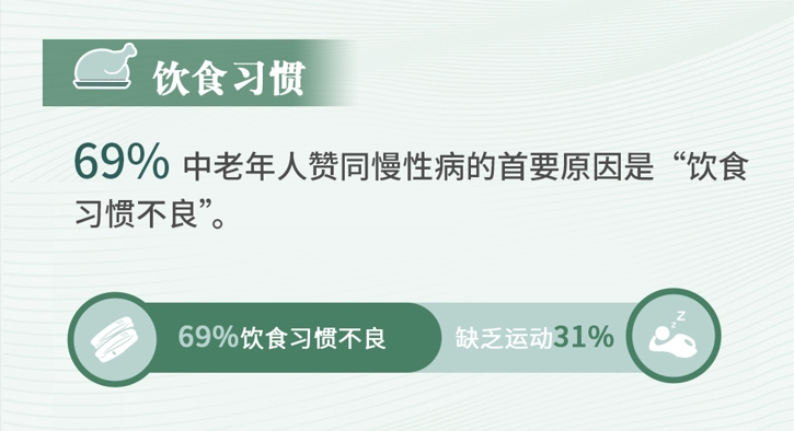 在睡眠、情绪、运动、饮食等诸多因素中,69%中老年人认为造成慢性病的根源首当其冲是不良的饮食习惯。《中国居民营养与慢性病状况报告(2023年)》重点强调了不健康的饮食习惯,如高盐、高糖、高脂饮食,以及缺乏全谷物和水果的摄入,是这些慢性病的重要风险因素。心血管疾病在中国的患病率和死亡率一直居高不下,同样,癌症、糖尿病和慢性呼吸道疾病的发病率也呈现出上升趋势,这些都与不良饮食习惯密切相关。