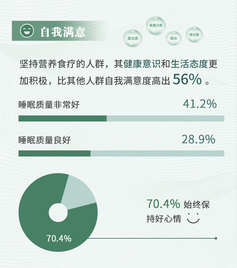 坚持营养食疗的受访者在自我整体评估方面表现出更高的“自我认可”。规律科学的饮食促成良好的生活习惯,作用在人们心理层面,形成更高的自我评估和自我勉励,进而影响个人生活的方方面面,包括睡眠习惯和情绪控制。其中70.4%的坚持营养食疗者始终保持良好心态,41.2%睡眠质量非常好,28.9%睡眠质量良好。可见营养食疗可以为人们全方面地改善自我身心状态。