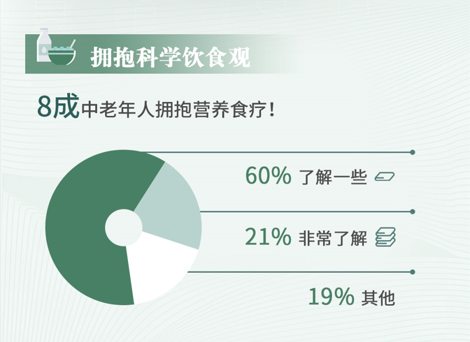 近年来,随着科普宣传,营养科学饮食愈发深入人心,加之原本食疗观念的传统文化影响,增强了大众尤其是中老年人对于“营养食疗”的认知。人们的饮食观正在转变,从满足吃饱、到追求吃好、再到注重吃对。八成中老年人有一定的饮食营养相关知识,21%中老年人熟知常见食物的营养价值,有意识按照一定营养科学的观念安排日常饮食。