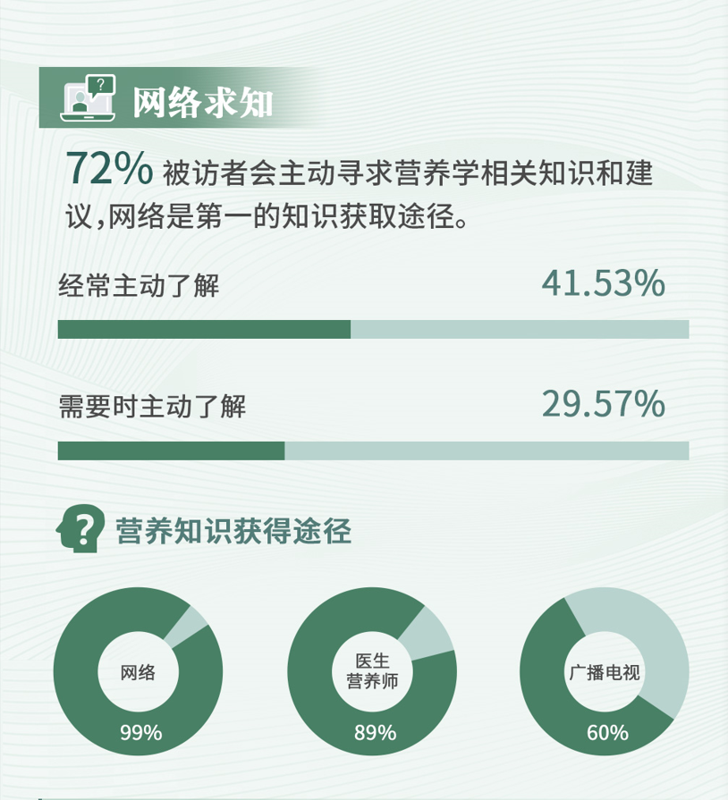 高达72%的被访者展现出了对营养学知识和建议的浓厚兴趣,他们积极寻求各种方式来丰富自己的营养学知识库。在这些寻求知识的途径中,网络无疑成为了他们获取营养学相关知识的首选方式。这一选择并非偶然,而是基于网络在信息传播上的独特优势。