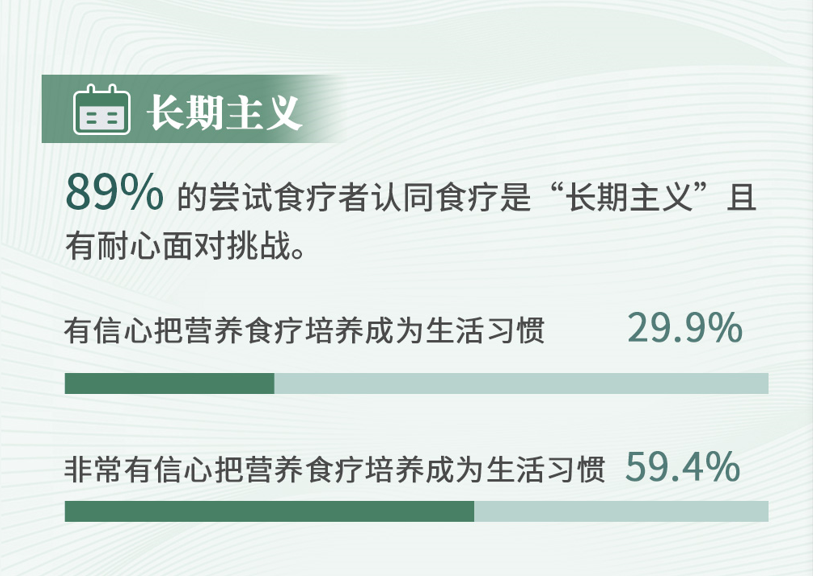 关于“您对践行营养食疗的态度”,总共有89%受访者对营养食疗持有正确的态度,他们将食疗视为长期行为,而不是投机取巧的临时治疗措施,59.4%受访者非常有信心把营养食疗培养成生活习惯。营养食疗不是健康投机,它是长期主义,甚至是终身主义。只有把营养食疗内化为习惯,才能显现出显著的效果,这里绝没有“灵丹妙药”只有“日久见效”。