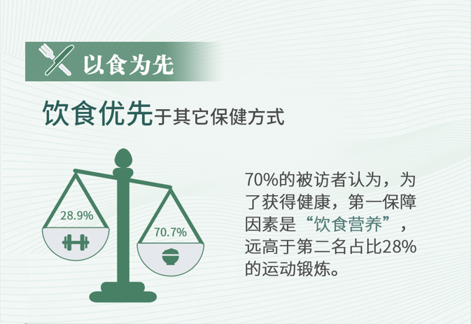 运动锻炼、优质睡眠、良好心情对于健康来说同样重要,但是70%被访者认为“饮食营养”是健康的第一保障因素,只有在健康科学饮食基础上,才能更有效发挥其它健康措施。世界卫生组织(WHO)和其他国际健康机构发布的全球健康报告中,经常强调饮食营养在促进全球健康中的核心地位。这些报告指出,改善饮食习惯是减少全球疾病负担和提高健康水平的关键措施之一。“民以食为天”,而健康则“以食为先”。