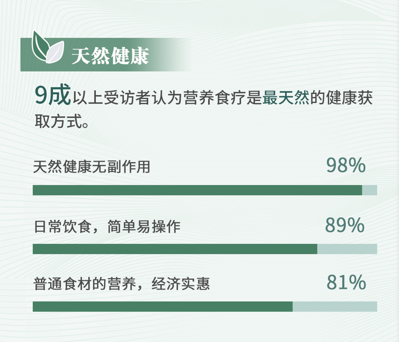 在问及看重营养食疗哪些优势时,高达98%受访者认可营养食疗是天然健康的疗法。追求“方式”的健康,才是根本上的健康,食疗这一优势自古以来被医家认可,《黄帝内经》记载“无毒治病,十去其九;谷肉果菜,食养尽之”,表明食疗可以调养身体,达到治疗的目的。相比之下药物可能会产生不良反应,包括与其他药物的相互作用,而食物则相对更加自然和安全。当然,要排除潜在的食物过敏或不耐受问题。