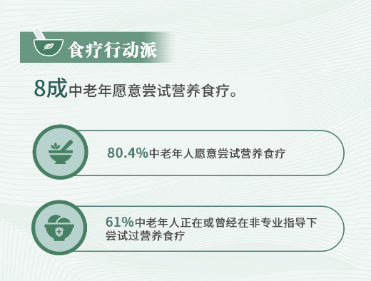 八成中老年表示愿意尝试营养食疗,更有61%的中老年人正在或曾经在非专业指导下尝试过营养食疗。虽然存在受访者对营养食疗定义的个体差异,但是总体来看,他们在主观上认定自己为营养食疗而行动过,表明越来越多的中老年成为营养食疗的行动派。不积跬步无以至千里,早一天行动,早一天收获健康,通过行动把营养食疗内化为生活方式,才能收获更牢固的健康人生。