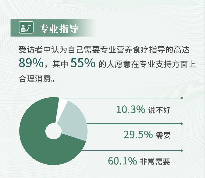受访者中认为自己需要专业营养食疗指导的高达89%,其中55%愿意在专业支持方面上合理消费。可见受访者对于营养食疗的专业性有着极高的要求,需要专业的营养师进行个性化的指导、监督和陪伴。这些需求提供了重要启示,营养食疗市场服务方面有着不容小觑的发展空间。