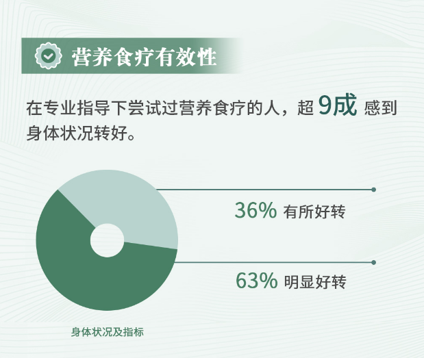 在尝试过营养食疗的受访者中,认为其身体状况明显好转有63%,有所好转为36%。营养食疗在改善慢性病方面起到显著的作用,受访者表示经过一段时间营养食疗之后,血糖血脂等各项指标有所改善。但是若要获得稳定的、长期的健康以及慢性病的防治,还是要长期坚持科学的营养食疗。世界卫生组织(WHO)和美国国立卫生研究院(NIH)均指出,通过增加富含膳食纤维的食物,增加维生素和矿物质的摄入,减少饱和脂肪、盐和糖的摄入,可以有效改善高血压、糖尿病、心血管疾病等慢性病。