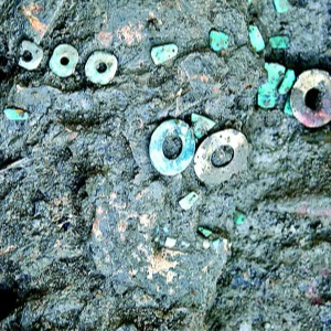 与此同时,村中大汶口文化墓地也不断有惊人的发现。11月中旬,我们清理遗址中最大的墓葬ⅣM3时,在墓室中部发现一组石圭,其形式有尖首、平首两类,与后世的玉圭如出一辙,专家认为这是迄今国内考古发现最早的“圭”。12月初,我们在清理墓葬ⅣM6时,发现一组由30多件玉璧、玉珠、绿松石片组成的面饰,覆盖于墓主的额头与面部。尤其值得注意的是,墓主的左右眼眶处分别覆盖着两件玉璧。古人死后下葬时有遮掩面部的习俗,所用之物即称为“覆面”,由于其核心功能在于遮挡眼睛,因此又称“幎目”。王庄遗址ⅣM6出土的玉面饰,显然已具备覆面的核心功能,可以确认是目前国内发现年代最早的玉覆面。
