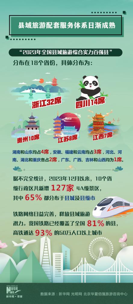 《全国县域旅游高质量发展研究报告2023》公布了“2023年全国县域旅游综合实力百强县”。这一榜单上,浙江、四川、贵州、江苏、江西等18个省份的县域地区上榜。全国上下,一场游客和县城的“双向奔赴”正隆重“上演”。一众宝藏小城异军突起,正是供需两端“双向奔赴”的结果。