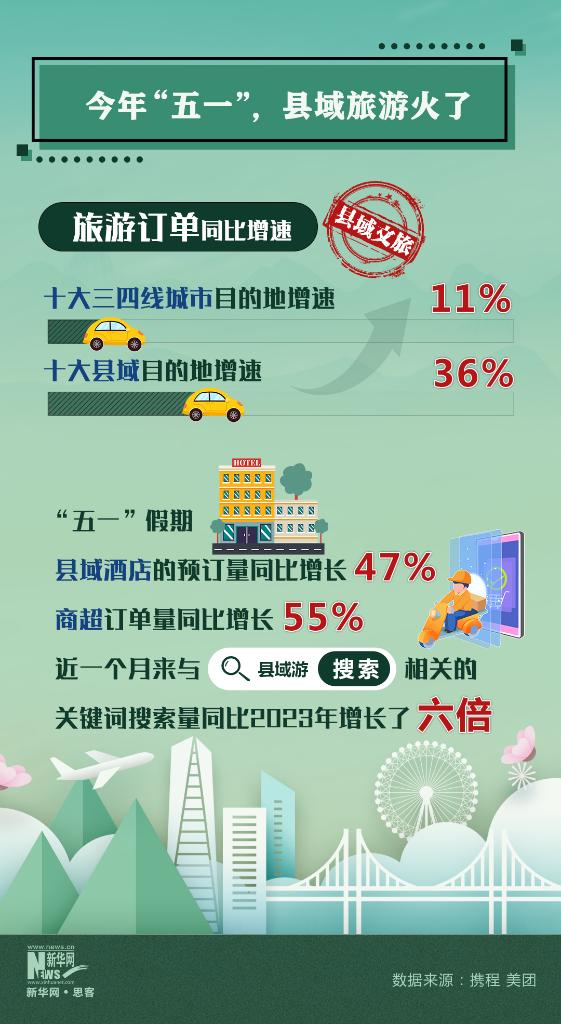如今,打开各大社交网络和预订平台,各种“小镇旅店”“乡野民宿”推荐扑面而来。美团数据显示,近一个月来,与“县城游”相关的关键词搜索量同比增长了6倍。在“五一”假期,县域酒店的预订量同比增长47%、商超订单量同比增长55%。和县城游、网红小镇打卡、古城深度游等词条有关的出游攻略、旅行周边推荐和团购项目也在“五一”期间迎来了一波小高潮。